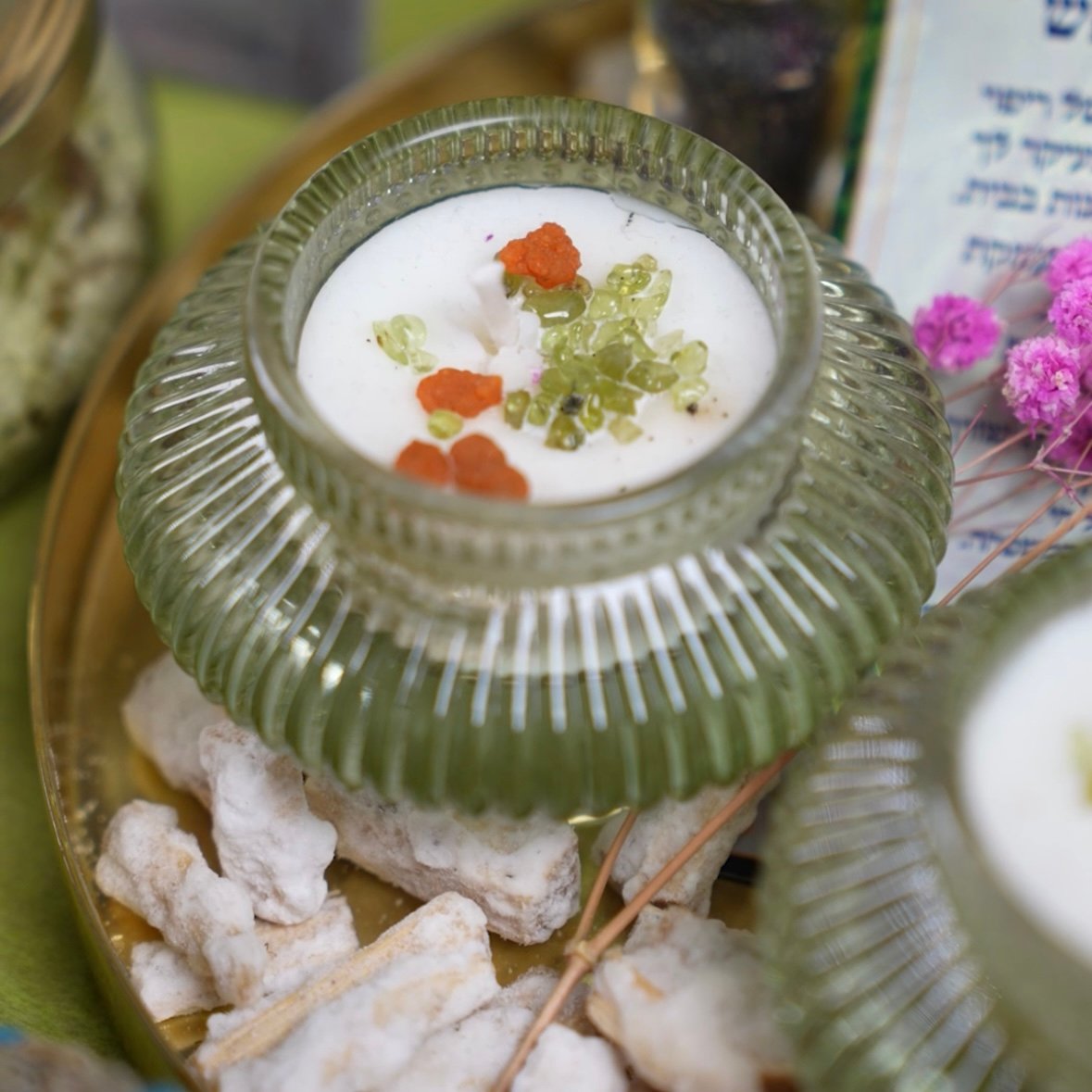 מגיע בכלי פמוטים ירוק להעמקת החיבור לצאקרת הלב, וברכה וריפוי לאנשי הבית . להדליק כל ראשון ושני או במידת הצורך למשך 10 דקות ולקרוא נשמת כל חי וכמובן לברך את הבית , המשפחה. הניחוח של הנרות קסום ומעניק תחושת שלווה ורוגע. כאשר השעווה מסתיימת הכלי משמש לך כלי לנרות גבוהים לכבוד שבת. הסט מגיע עם מטפחת לבנה תחרה , תפילת נשמת כל חי וגפרורים ותהילים קטן לשמירה.