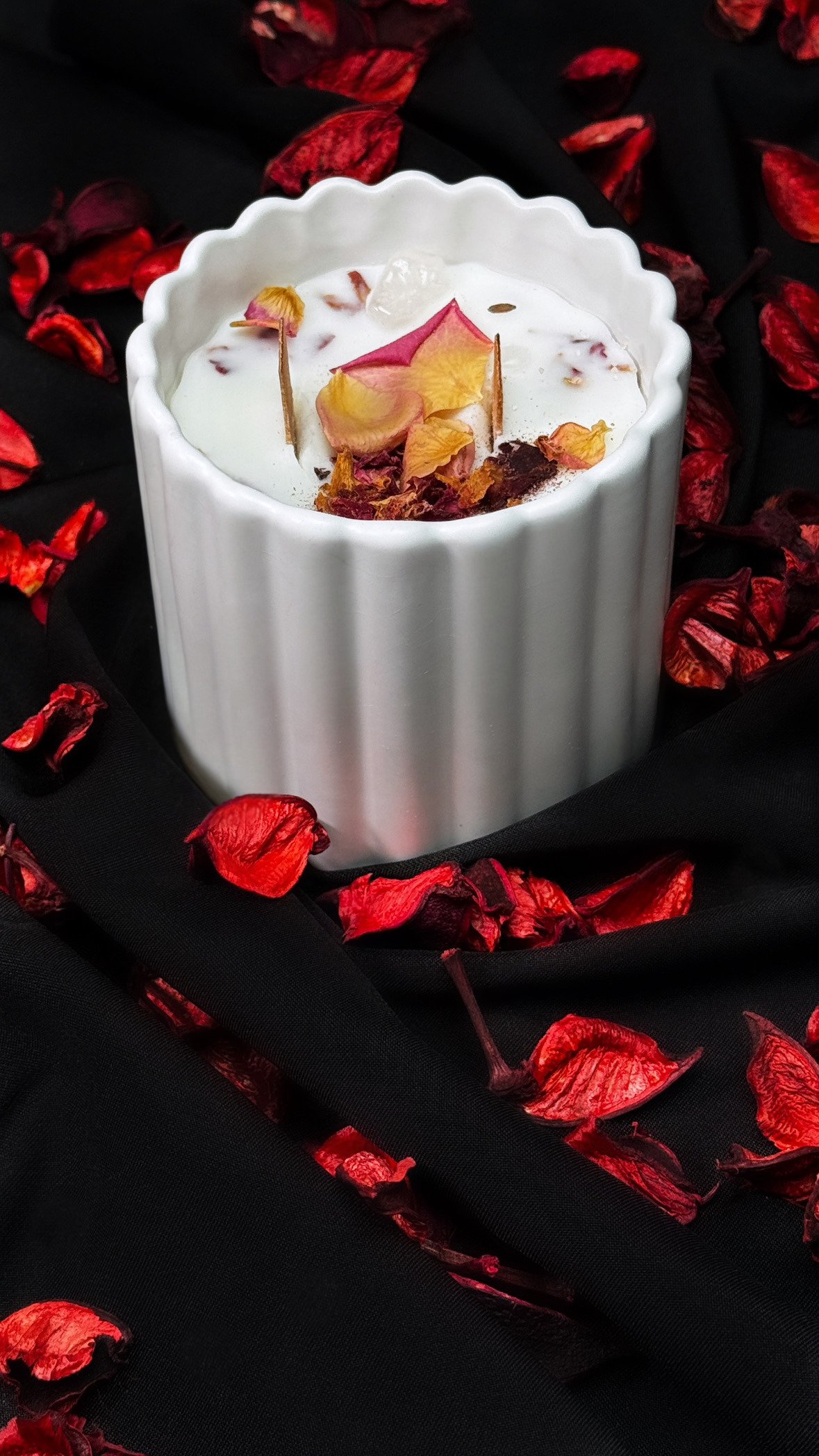 אבקת מסקוטה אדומה – הנר מועשר בעלי ורדים ריחניים ואבקת מסקוטה אדומה, בעלי סגולות לשחרור חסימות רגשיות, שמירה על זוגיות קיימת וזימון האהבה.